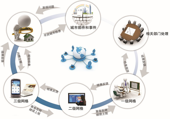 城镇区域化管理主要是依托于统一的管理以及数字化平台,将城镇按照一定的标准划分成统一的单元网格,通过加强对单元网格的部件和事件巡查,建立一种监督和处置互相分离的形式。城镇区域化管理平台主要在线上实现对城镇信息的统一管理操作,通过一定标准将城镇所有信息划分成“人、地、物、情、事、组织”6大网格,并通过平台对相应数据进行统一的编辑、处理更新,实现城镇信息全面覆盖管理,实时监控相关数据信息。